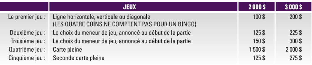 Une somme de 2000 $ est divisée entre les gagnants des cinq jeux lors des bingos réguliers.