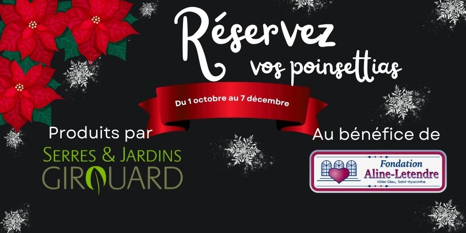 Du 1er octobre au 7 décembre 2025, réservez vos poinsettias au coût de 29.99 $au https://www.jedonneenligne.org/fondationalineletendre/POI2025